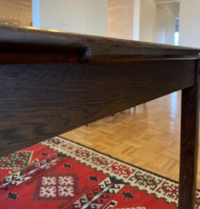 Pöytä jatkolevyllä ja 8 kpl tuolit, palisanteria, Asko 1960-luku, tilava 8-hengen tilava pöytäryhmä, leimattu Asko Mitat: K.72 150×90+jatkopalat Tuolit K.73 istuink.43