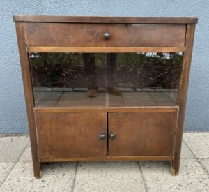 Funkkisvitriini koivua 1940-luku, laatikko ja kaappi, pientä sanomista, lasiset liukuovet vaatii kunnostuksen tms.. Mitat: K.65 kansi64x38