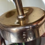 Kattovalaisin jugend 1900-luvun alkupuoli, kupari/messinki, käsinhiottu lasi, valopisteet 4 kpl, hiljattain uudelleen sähköistetty Mitat: K.80 Halk.45
