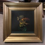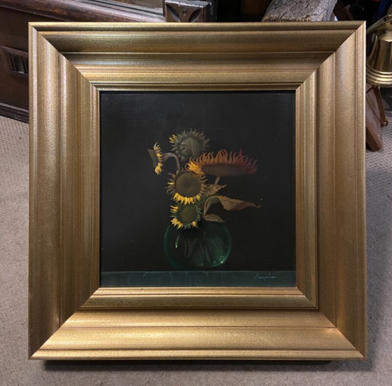 Öljyvärimaalaus levylle, auringonkukkia, sign. Antti Lampisuo Mitat: 43 x 44