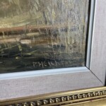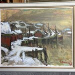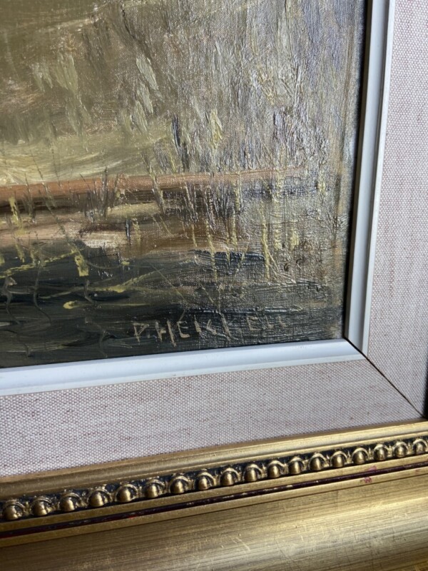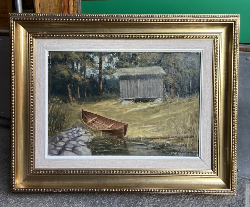 Öljyvärimaalaus levylle, vene rannalla, sign. P.Heickell Mitat: Myöh.