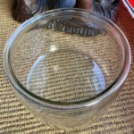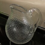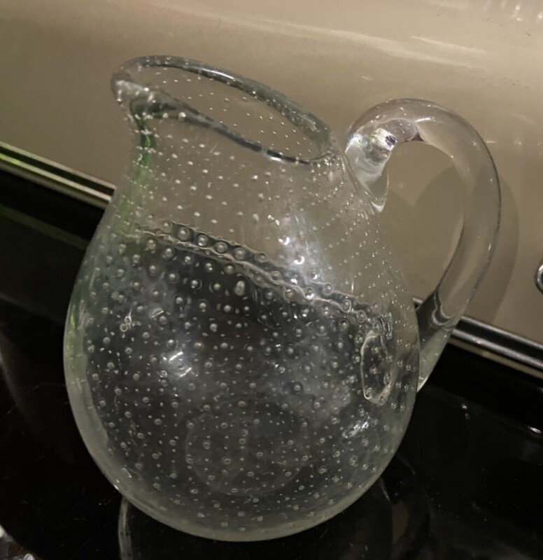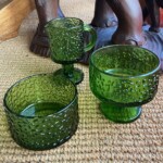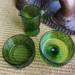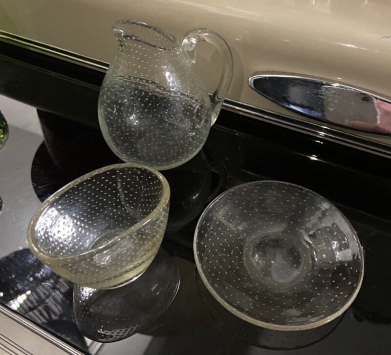 Gunnel Nyman, kermanekka, pieni malja ja aluslautanen, piikkimuottiin puhalettua lasia Mitat: myöh.