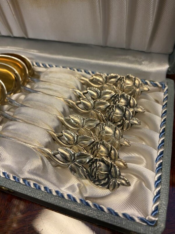 Romantica aterimia ja ottimia -jälkiruokalusikat 6 kpl kotimaista 830-leimattua hopeaa. Mitat: P.16,5 Myyntihinta: -lusikat 6 kpl/rasia (rasiat 2 kpl) kotimaista... Lue lisää