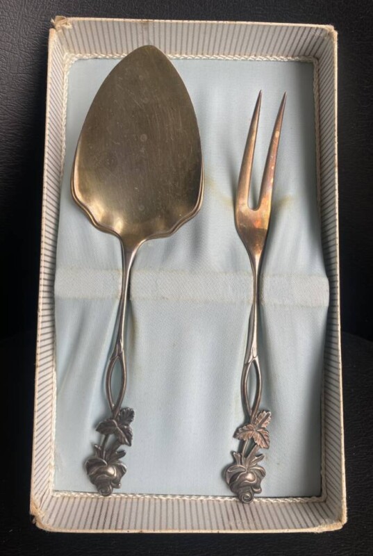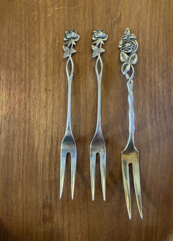 Leikkelehaarukat 2 kpl -pienempi haarukka leimattua 813-kotimaista hopeaa, v.1967 Mitat: P.12 -suurempi haarukka leimattua 813-kotimaista hopeaa, v.1964 Mitat: P.14
