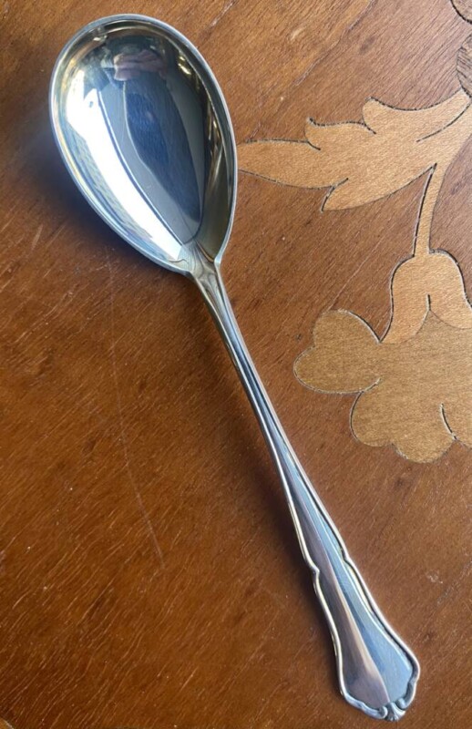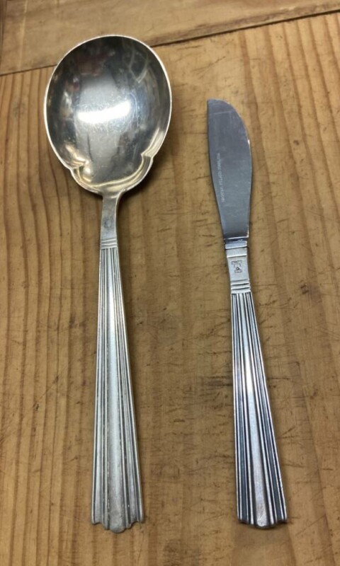 Kummilusikka kotimaista 813-leimattua hopeaa, v.1948, kaiverrus takana. Mitat: P.14 Myyntihinta: 45,00 € Haarukka kotimaista 813-leimattua hopeaa, v.1947, kaiverrus edessä Mitat:... Lue lisää