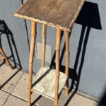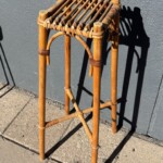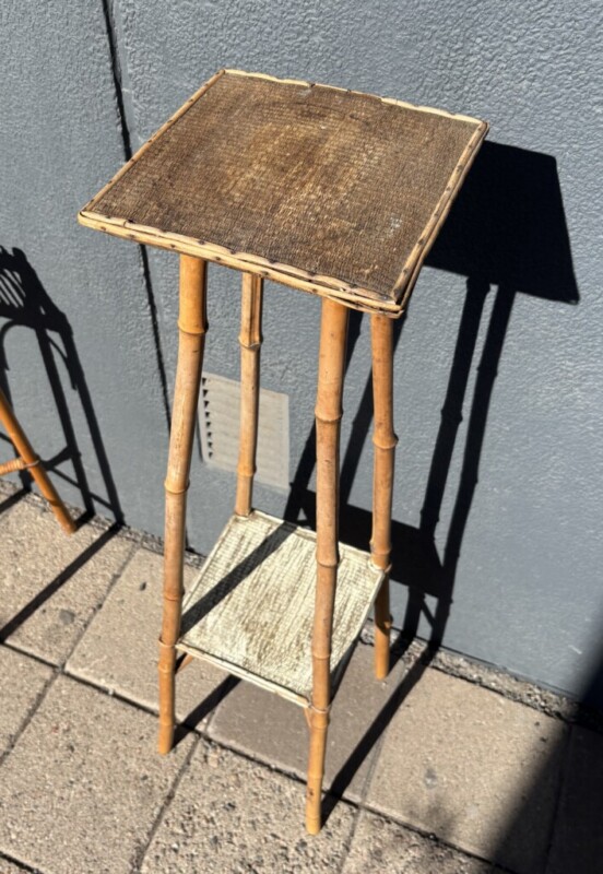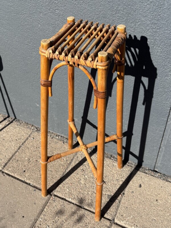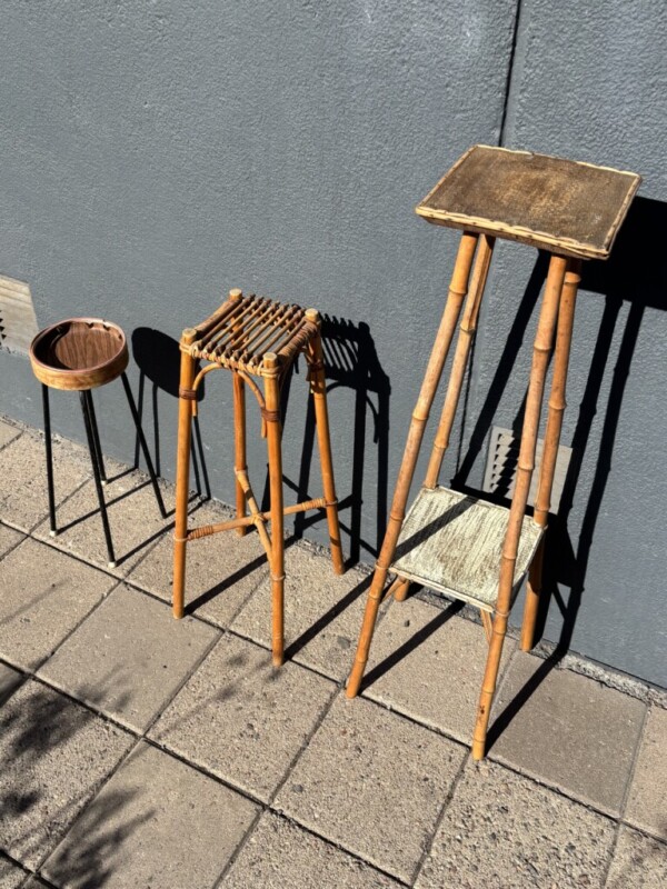 Pylväät kolme kappaletta, metallia, rottinkia ja bambua. Mitat: K.56, 77, 113.