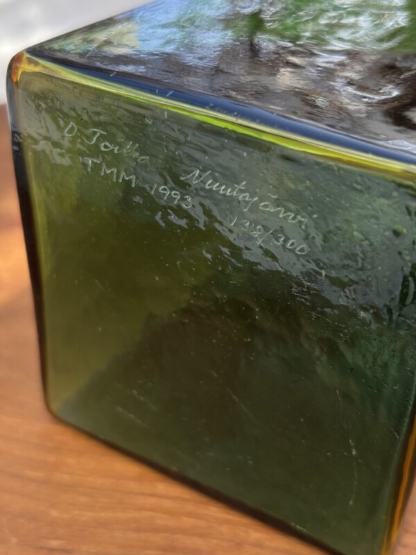Signeeraus "O. Toikka Nuutajärvi TMM 1993 138/300" Koristepullo jota on valmistettu 300 kappaletta. Numeroitu 138. Mitat: K.17 (ilman korkkia)