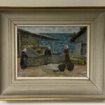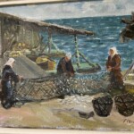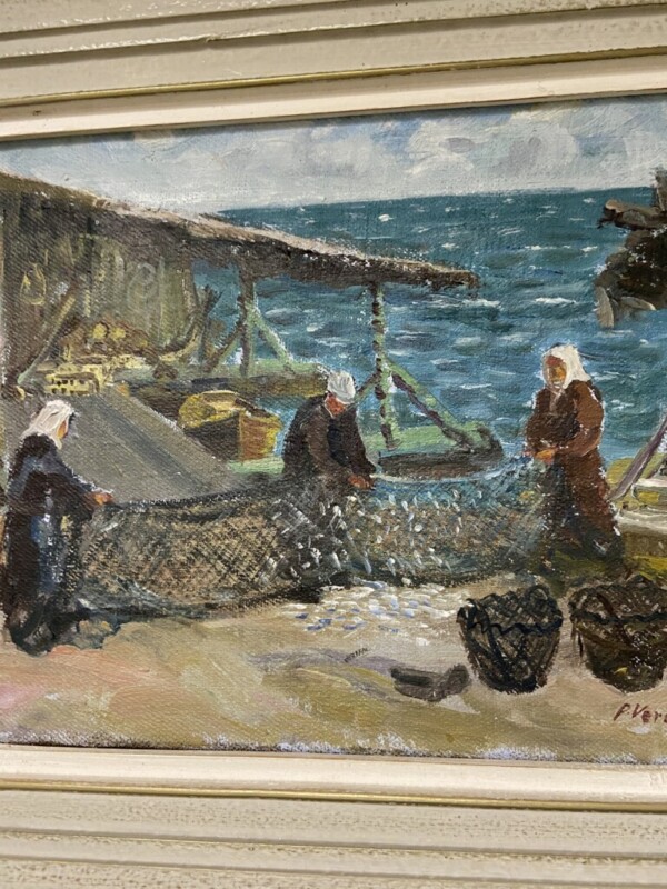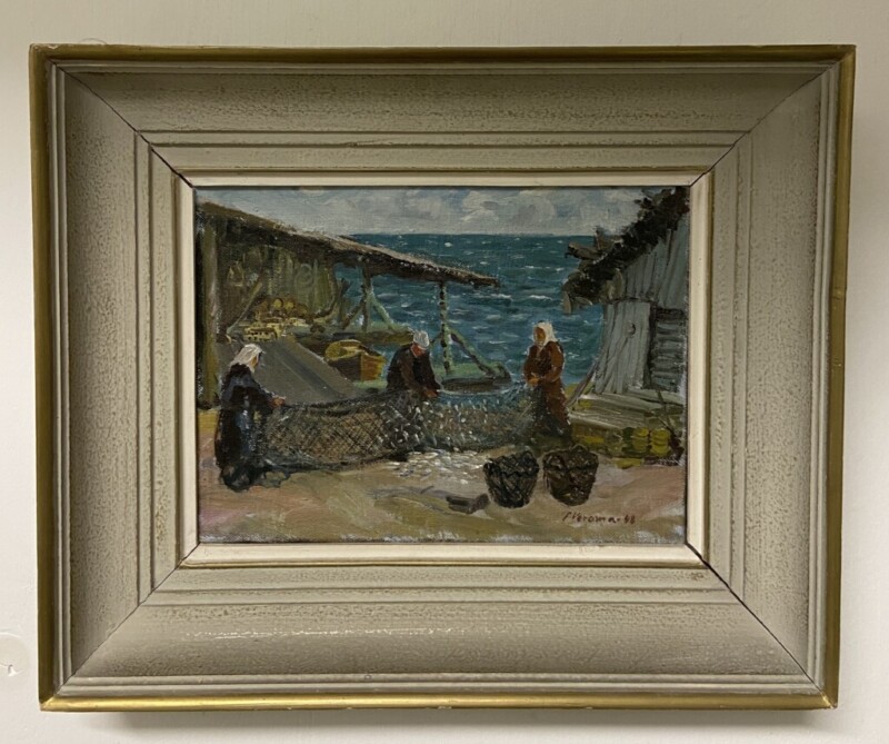 Öljyvärimaalaus, kalaverkon putsausta saaristossa, sign. P.Veroma -48 Mitat: 51 x 42