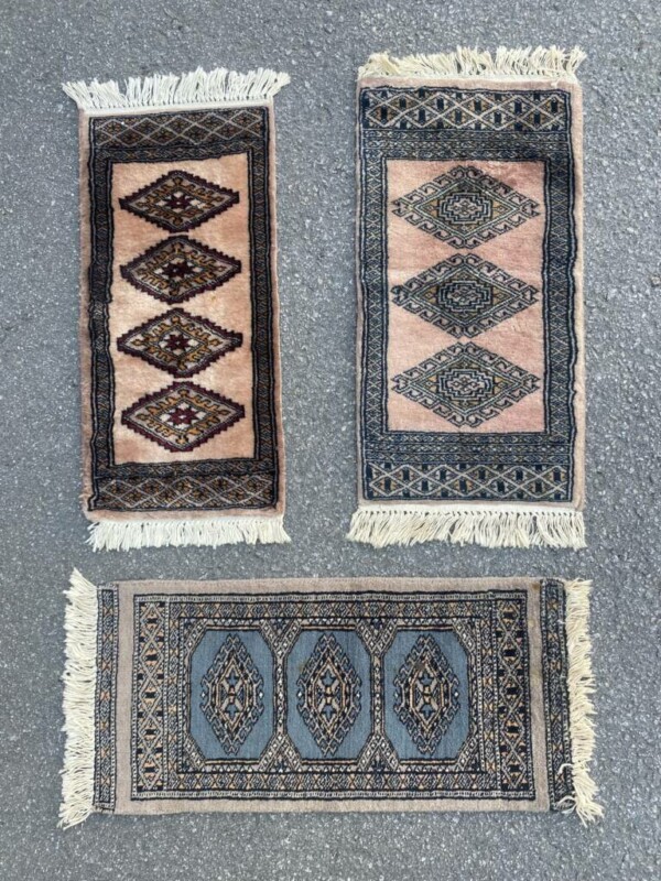 Pienet itämaiset villamatot. Mitat: Vasen 61x29 Myyntihinta: 55,00 € Mitat: Oikealla 62x32 Myyntihinta: 55,00 € Mitat: Alhaalla 73x32 Myyntihinta: 55,00... Lue lisää