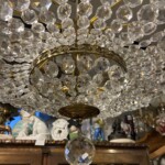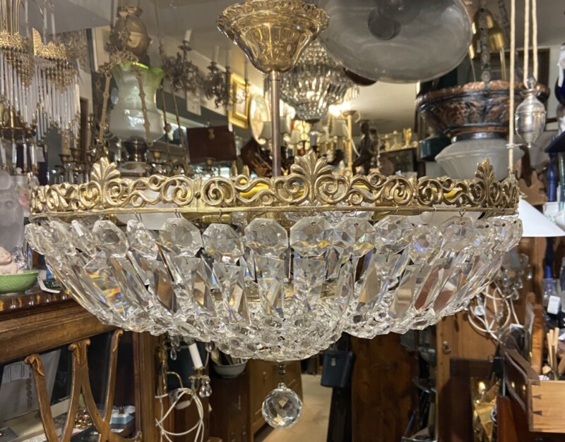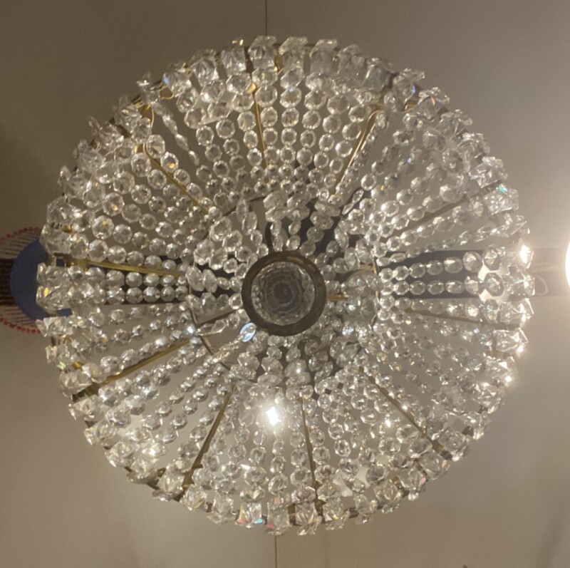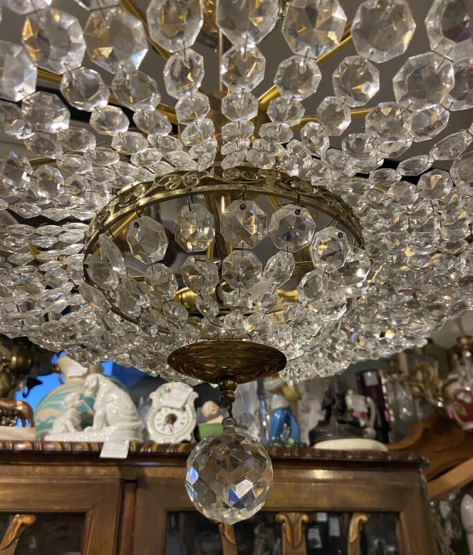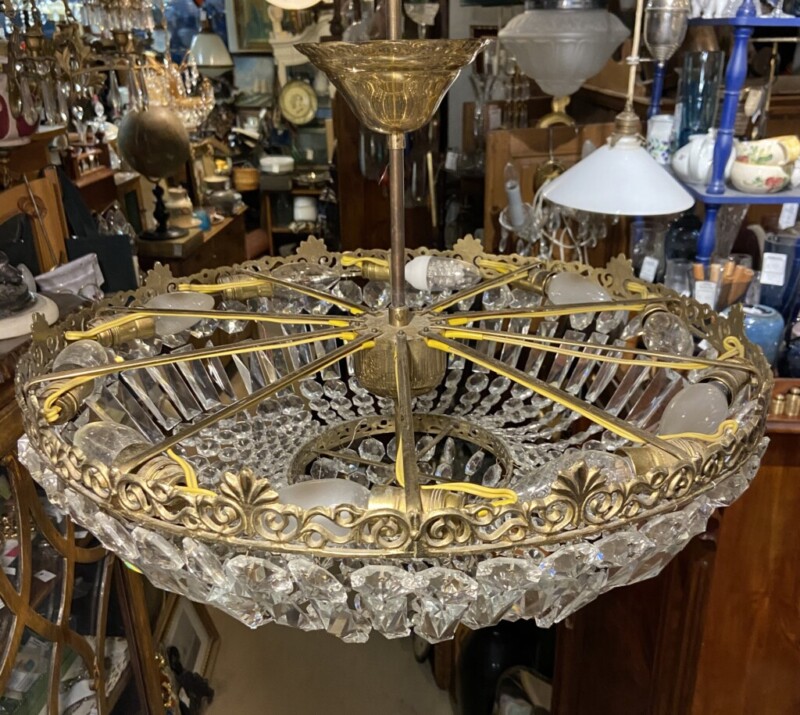 Kristallikruunu 1900-luvun alkupuoli, messinkirunko Mitat: K.78 Halk.58
